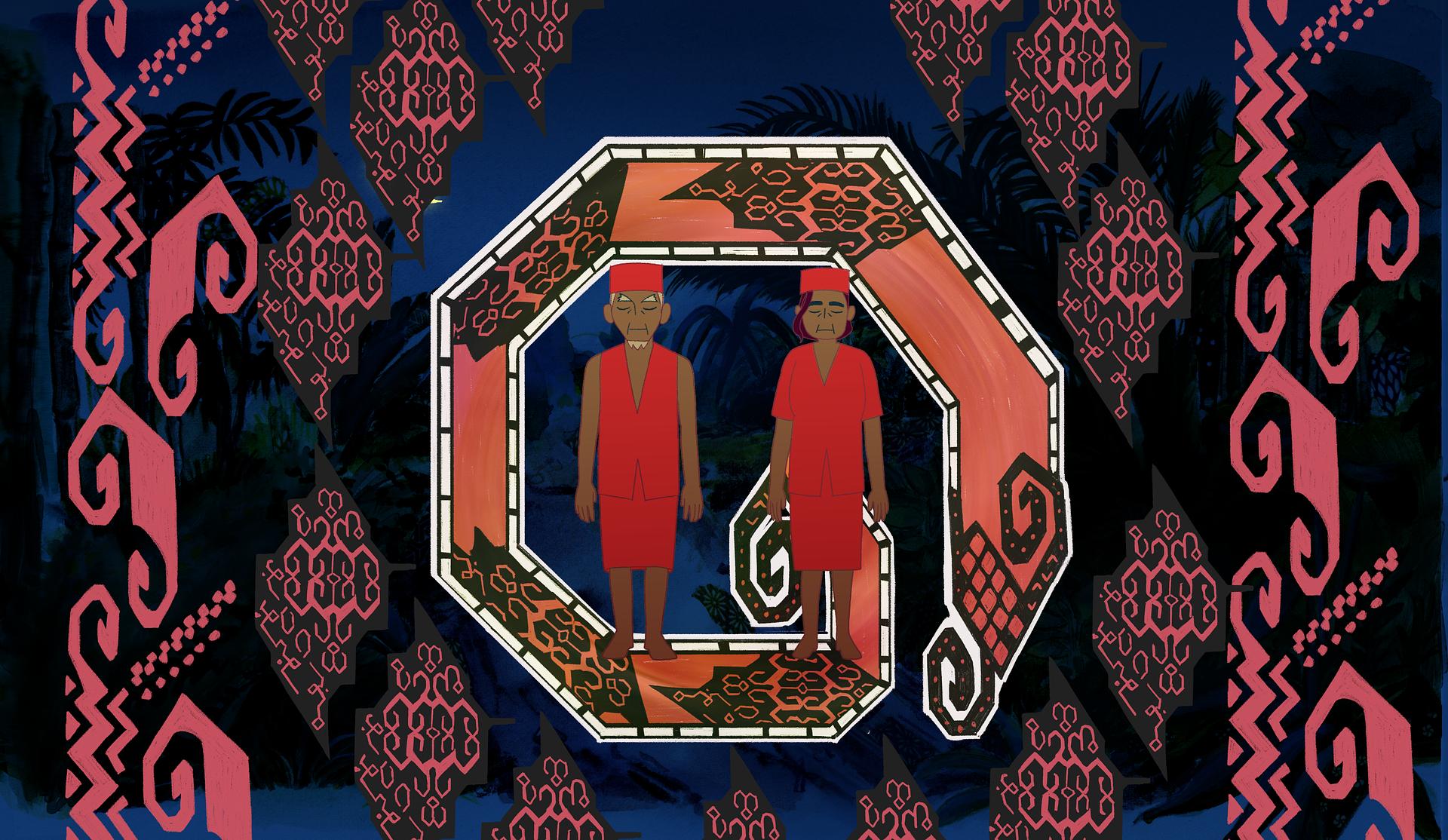 Traditional Dayak motifs in red and black were used to imagine Mekar Raya's snake ancestor Nabau. Illustration: Laura Nasir-Tamara.
