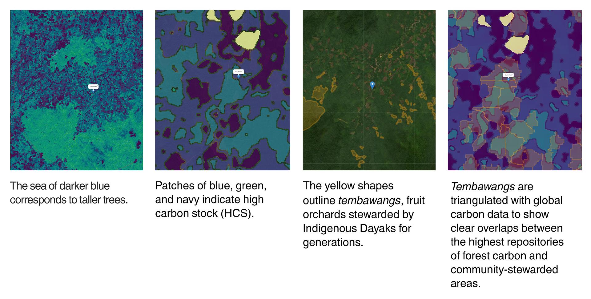 When tembawangs are layered above canopy height, above ground biomass, and high carbon stock as the fourth variable, overlaps between community-stewarded areas and carbon-dense forests are substantially greater than neighboring areas that were not managed by the community. The prototype shows, in quantifiable terms, that the areas stewarded by the community for generations are measurably more carbon-dense than neighboring unmanaged forests.